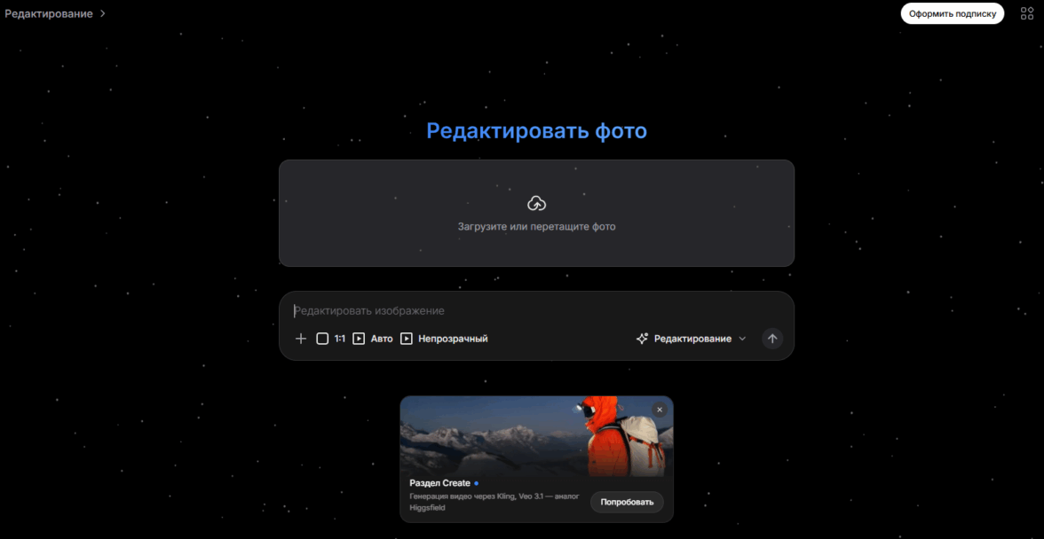 Многофункциональная площадка с передовыми нейросетями (Grok, Gemini, Google Veo, DeepSeek) для реализации креативных проектов. Сервис позволяет генерировать изображения, видео, аудио и тексты. Пользователь может переключаться между моделями ИИ, если его не устраивает результат. Доступна история чатов и возможность загрузить свой файл для редактирования картинки. Нейросеть позволяет удалить текст с фото или добавить объекты.