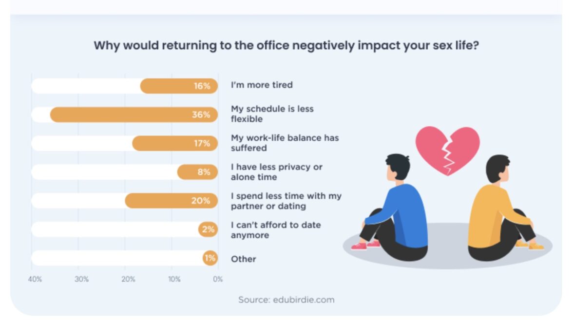 Чем же так пугает зумеров офисная работа? Самый частый ответ (его дали 36% опрошенных) — жизненный график станет менее гибким. Второй по популярности ответ (20%) — будет меньше времени на то, чтобы быть с партнером или ходить на свидания. Каждый шестой (16%) считает, что от работы в офисе будет сильнее уставать — будет не до секса. А каждый пятидесятый опрошенный (2%) считает, что из-за офисной работы у него (нее) вообще не останется времени, чтобы ходить на свидания.