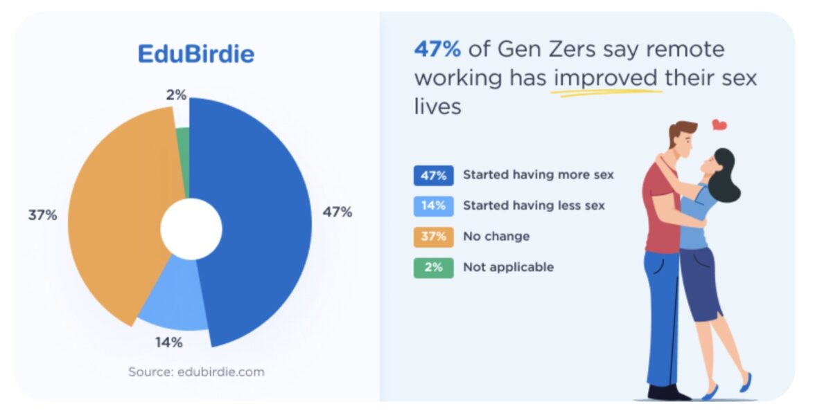 Как показал опрос EduBirdie, 47% молодых людей после ухода из офиса стали чаще заниматься сексом. Этому способствует отсутствие поездок на работу и гибкий график, благодаря которому появляется больше свободного времени в течение дня. «Перерывы на обед стали намного жарче, совещания переносятся в спальню, а выражение “трудиться допоздна” приобрело совершенно новое значение», — отмечают авторы исследования.