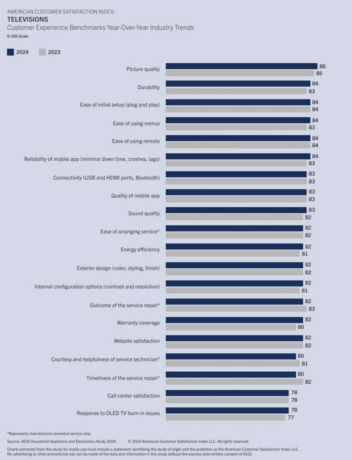 Согласно исследованию, удовлетворенность американцев телевизорами достигла исторического максимума, увеличившись на 1 балл до 82 баллов (из 100 баллов равных 100-процентному удовлетворению). Персональные компьютеры, включающие настольные компьютеры, ноутбуки и планшеты, также получили рекордный балл — 81 балл (+1 балл). А вот бытовой техникой американцы в этом году не довольны. Стиральные машины, сушилки, посудомоечные машины, холодильники, плиты и микроволновые печи сверхвысокой мощности — опускается на 1 балл до показателя 80 баллов. Потребители оказались недостаточно довольны как качеством продукции, так и обслуживанием.