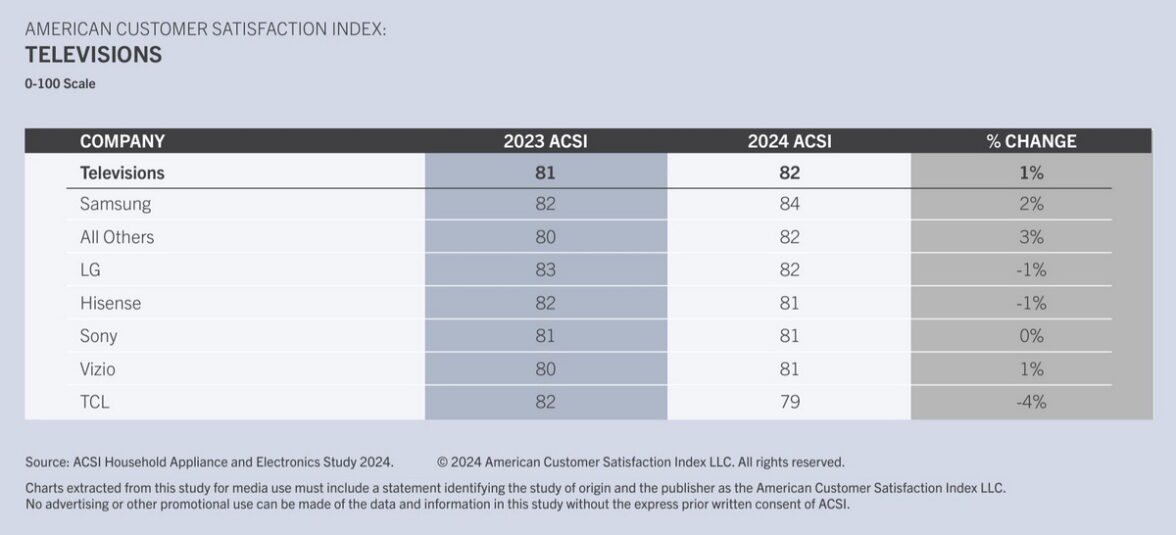 Компания ACSI представила свое ежегодное исследование «ACSI Household Appliance and Electronics Study 2024», в котором опубликовал данные об уровне удовлетворенности американских потребителей продукцией брендов, выпускающих телевизоры, компьютеры и бытовую технику.