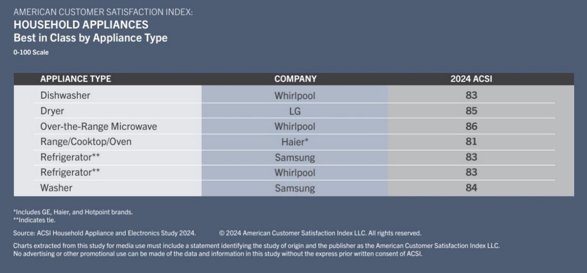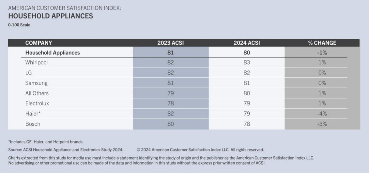 Whirlpool заняла первое место среди бытовых приборов, улучшив показатель ACSI на 1 балл, до 83 баллов. Второе место, как и годом ранее занимает южнокорейский бренд LG (82 балла). «Бронза» также второй года и также у южнокорейцев — Samsung (81 балл).