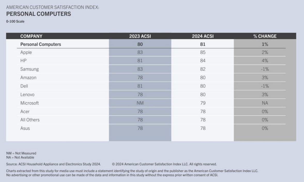 Компания Apple, чьи пользователи оказались удовлетвореннее качеством ноутбуков и планшетов в этом году, чем в прошлом, возвращает себе единоличное первое место, увеличив свой показатель ACSI на 2 балла до 85 баллов. Второе место рейтинга заняла другой гигант IT-индустрии HP, которая показала самый впечатляющий рост за год, прибавив сразу 4 балла (итоговый балл — 84). А вот Samsung, делившей в прошлом году первое место, потерявший всего 1 балл индекса откатился сразу на третье место.