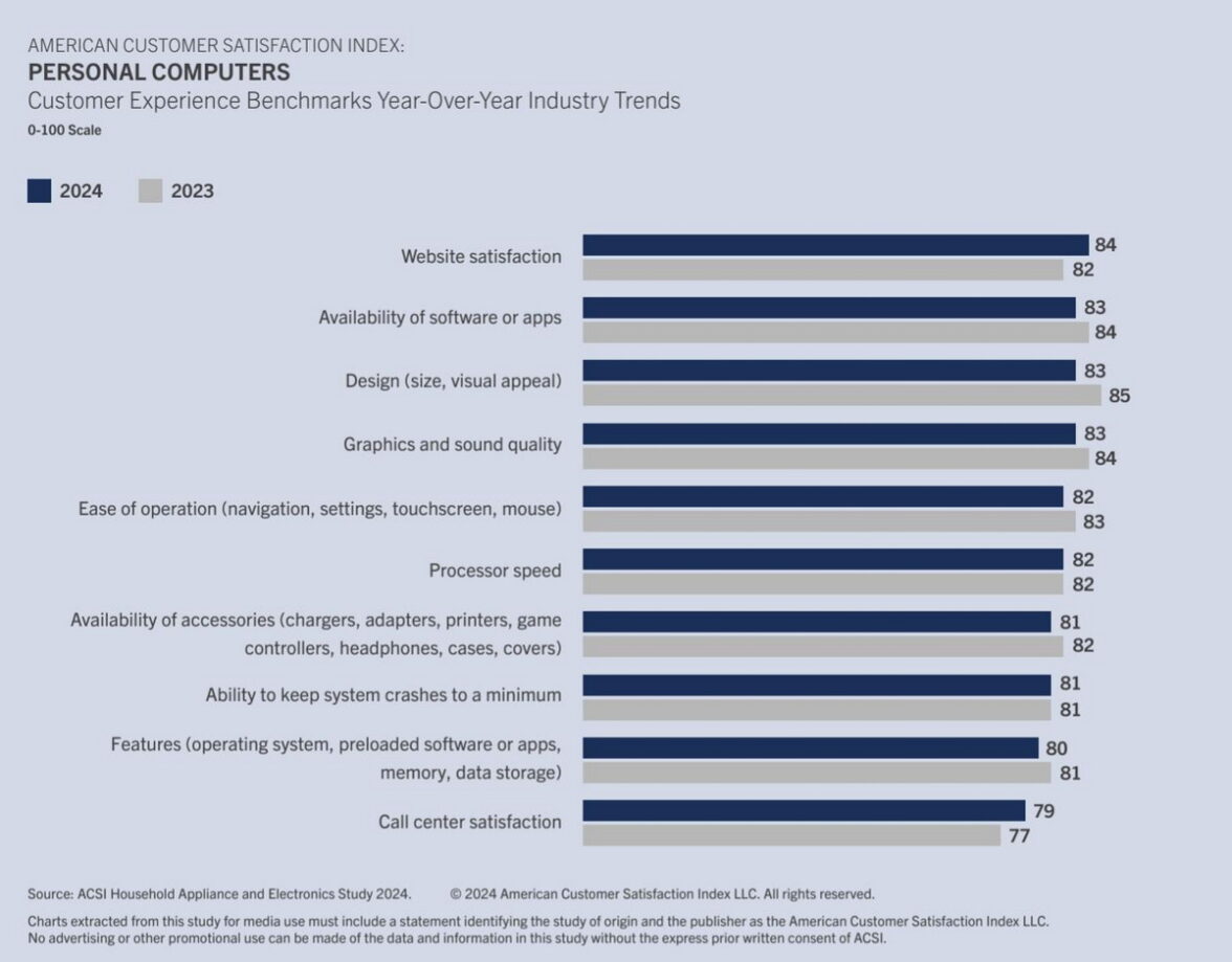 Что касается критериев, рассматриваемых в отчете, то, в целом, в товарной группе «Компьютеры» все выглядит не так уж и хорошо. Большинство показателей или не растут, или падают. По сравнению с прошлым годом, в 2024 году американским потребителям больше понравились лишь сайты компаний производителей и работа колл-центров. Другие показатели, как например, «Скорость работы процессора» или «Способность минимизировать краш систем», не изменились или, как «Качество звука и изображения», «Дизайн устройства», «Навигация», упали.