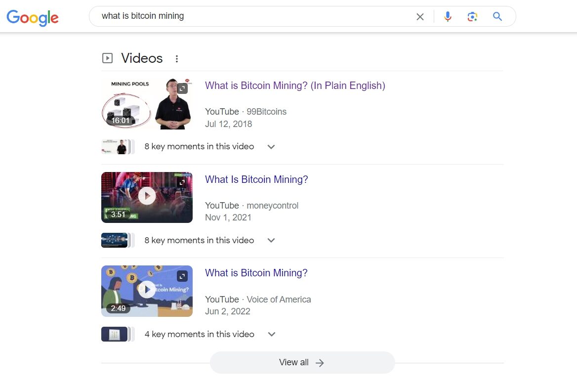 Видео What is Bitcoin Mining? (In Plain English) стоит в Google на четвертой позиции. За пять лет ролик набрал 3,6 млн просмотров.