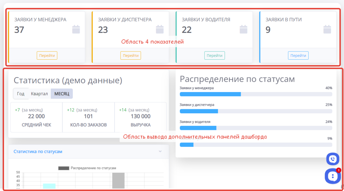 У нас есть компонент Дашборд, позволяющий вывести 4 неких показателя, у каждого может быть своя ссылка, иконка, подсказка. Под дашбордом могут располагаться панели, в которых выводятся таблицы, графики и так далее.