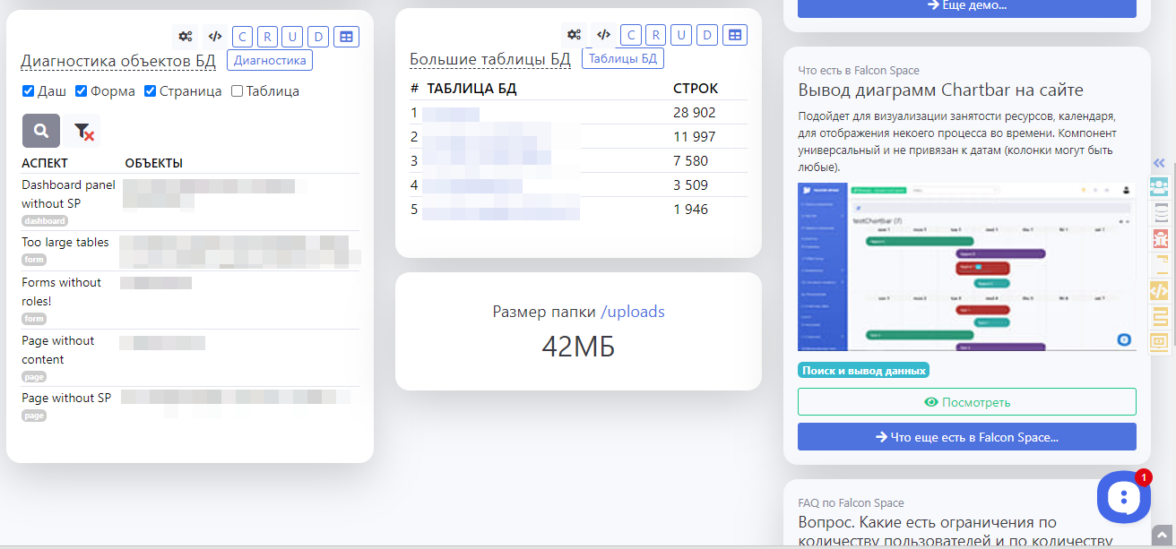 Информация по Falcon (советы, возможности, вопросы-ответы и полезные ссылки) — эти панели выделены серым-синим.