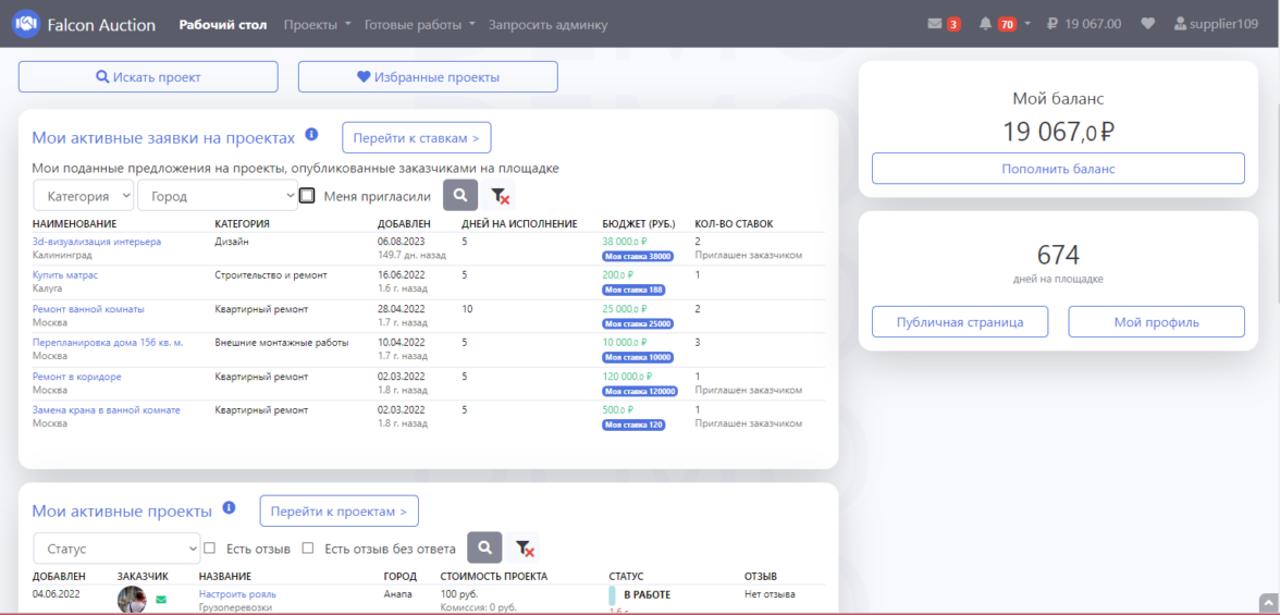 Пример дашборда Исполнителя на решении Falcon Auction: