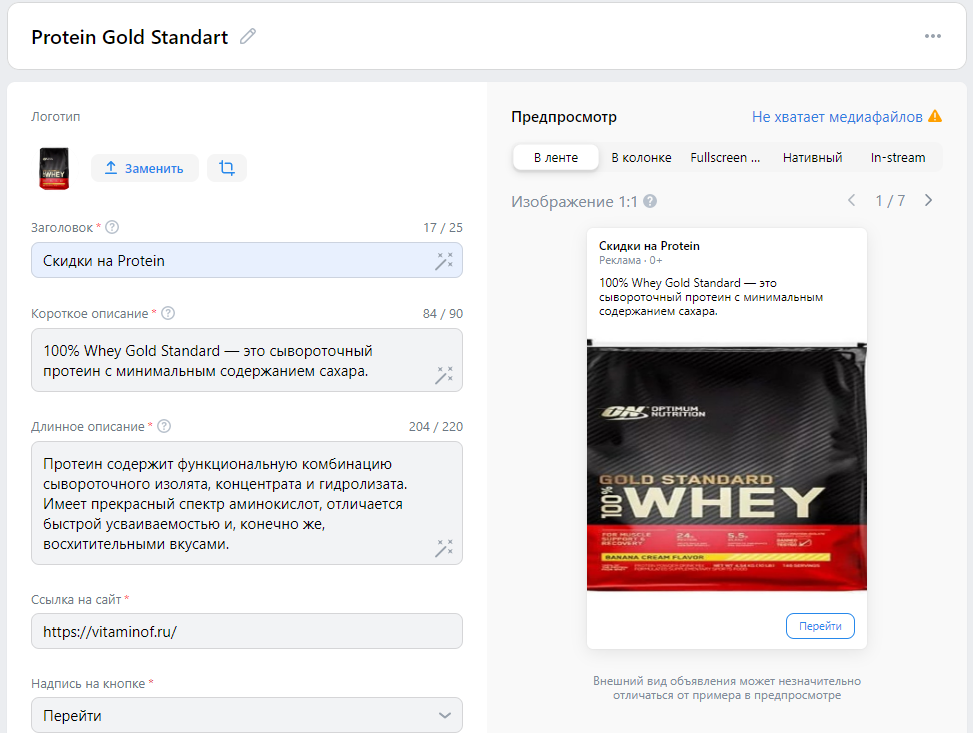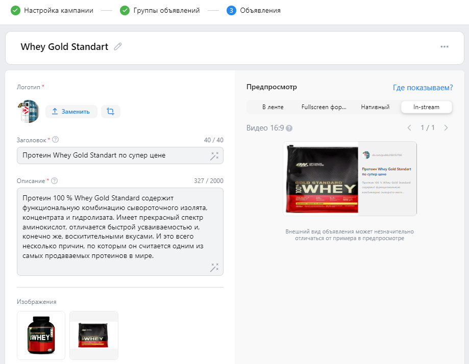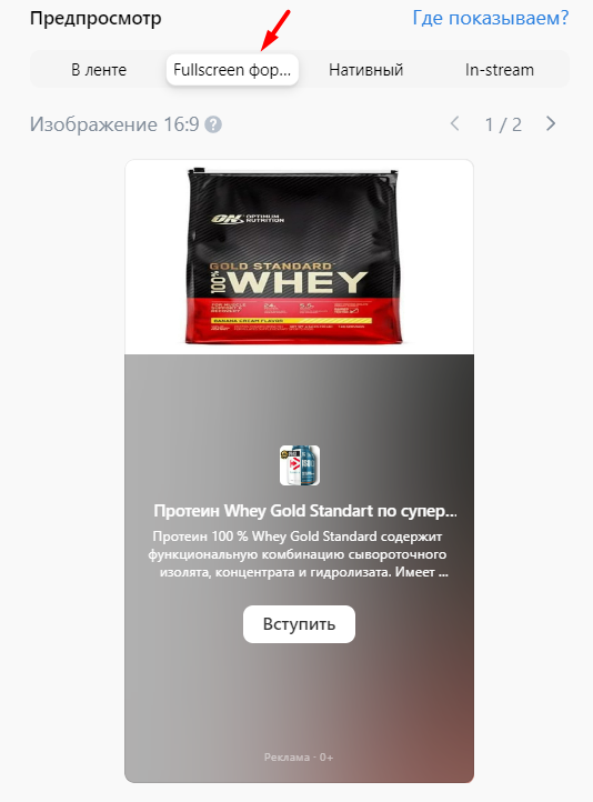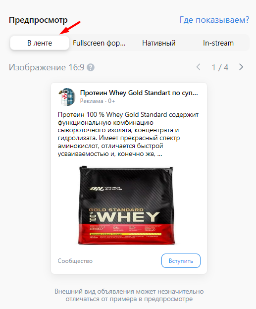 Справа вверху доступен предпросмотр объявления. Здесь можно посмотреть, как реклама будет выглядеть в ленте: