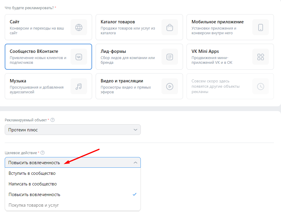 Настроить рекламу лонгрида свыше 16 000 символов в VK Рекламе также можно. Для этого в настройках кампании надо выбрать цель «Повысить вовлеченность». То есть возможности новой платформы абсолютно не уступают возможностям старого кабинета ВКонтакте.