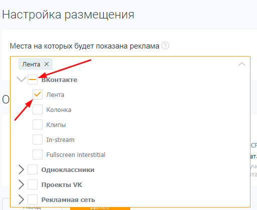 Настроить места показа можно на шаге «Таргетинги», в блоке «Настройка размещения». Можно выбрать все плейсменты или, например, оставить только ленту ВК: