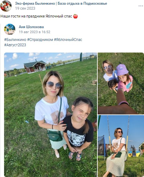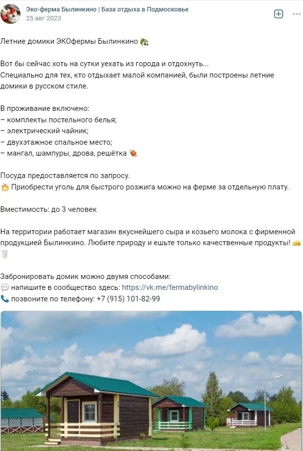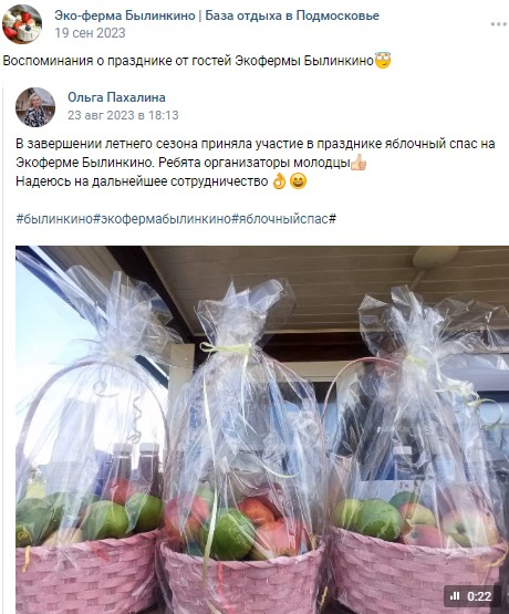 В сообществе экофермы «Былинкино» были опубликованы следующие посты: анонсирующий пост, пост-напоминание, пост о проведенном мероприятии.