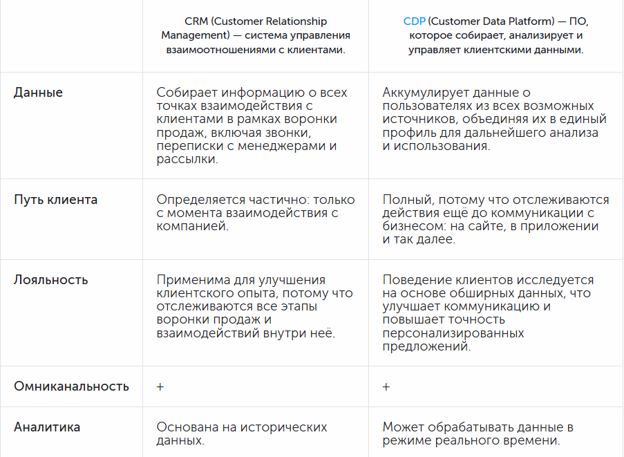 Подход CVM требует использования систем управления, обеспечивающих сбор и обработку данных о клиентах. В этом процессе ключевую роль играют CRM- и CDP-системы, которые могут применяться как отдельно, так и в интеграции.