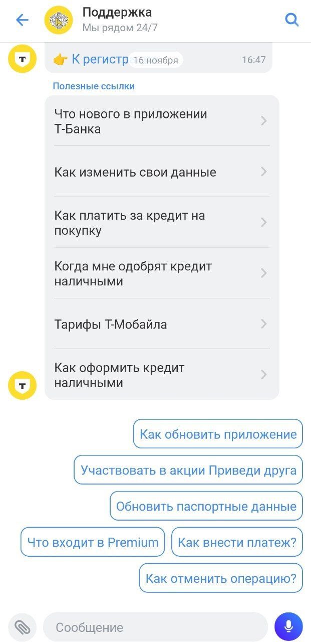 Пример чат-бота в приложении Т-Банка