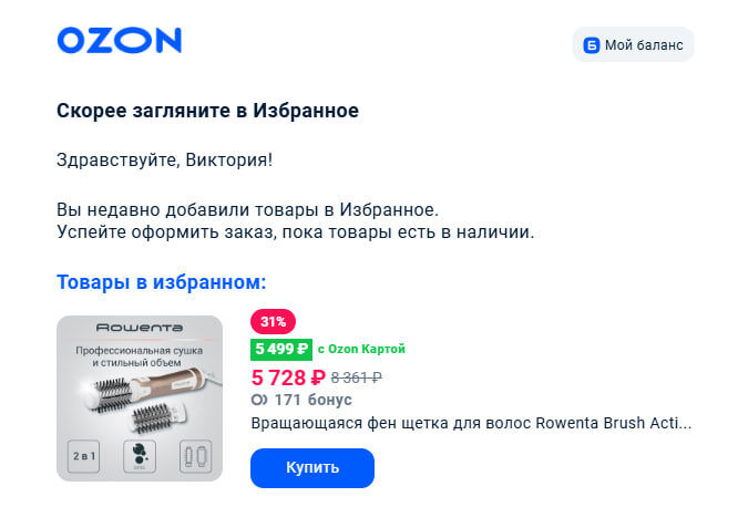 Напоминание от Ozon о товарах в Избранном