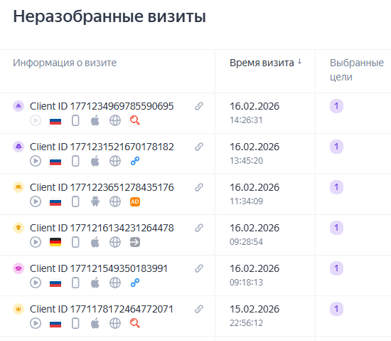 Доступ к нему открывается через боковое меню Метрики, где отображаются все визиты с потенциальными конверсиями (цели типа «Заявка», «Перезвонить»). Пользователь вручную или массово привязывает визит к заказу, указывая детали: номер заказа, сумму, дату, статус.