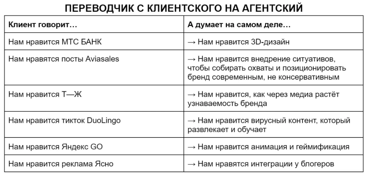 Эффективнее в этом плане запрашивать у клиента точечные референсы. Если приходят с Авиасейлс, то уточнять, что именно нравится: TOV, набор соцсетей или контент.