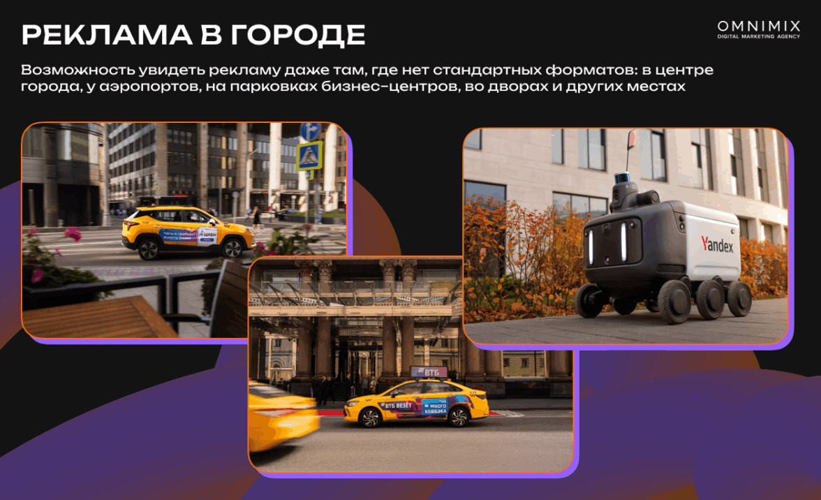 UrbanAds соединяет digital и офлайн, превращая город в живую медиа-площадку. Брендирование такси, каршерингов и роботов-курьеров создаёт дополнительные точки визуального контакта, усиливая присутствие бренда вне экрана. Этот формат особенно ценен в рамках масштабных имиджевых кампаний, где важно сочетать онлайн-размещения с физическим, заметным присутствием в городской среде, создавая синергию между digital и офлайн-контактами.