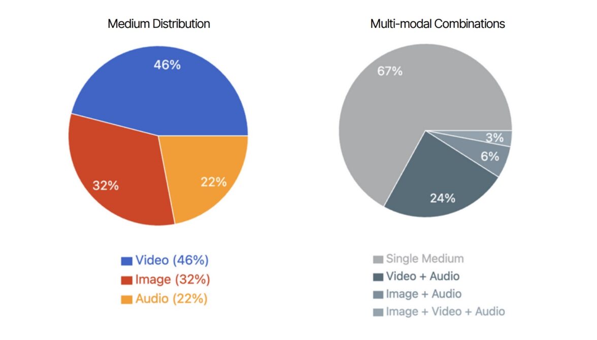 Слева: форматы дипфейков. Синий цвет — видео, красный — изображение, желтый — аудио. Справа, мультимодальные комбинации дипфейков, в порядке убывания доли — единственный формат, комбинация видео и звука, комбинация фотографии со звуком, комбинация фотографии, видео и звука.
