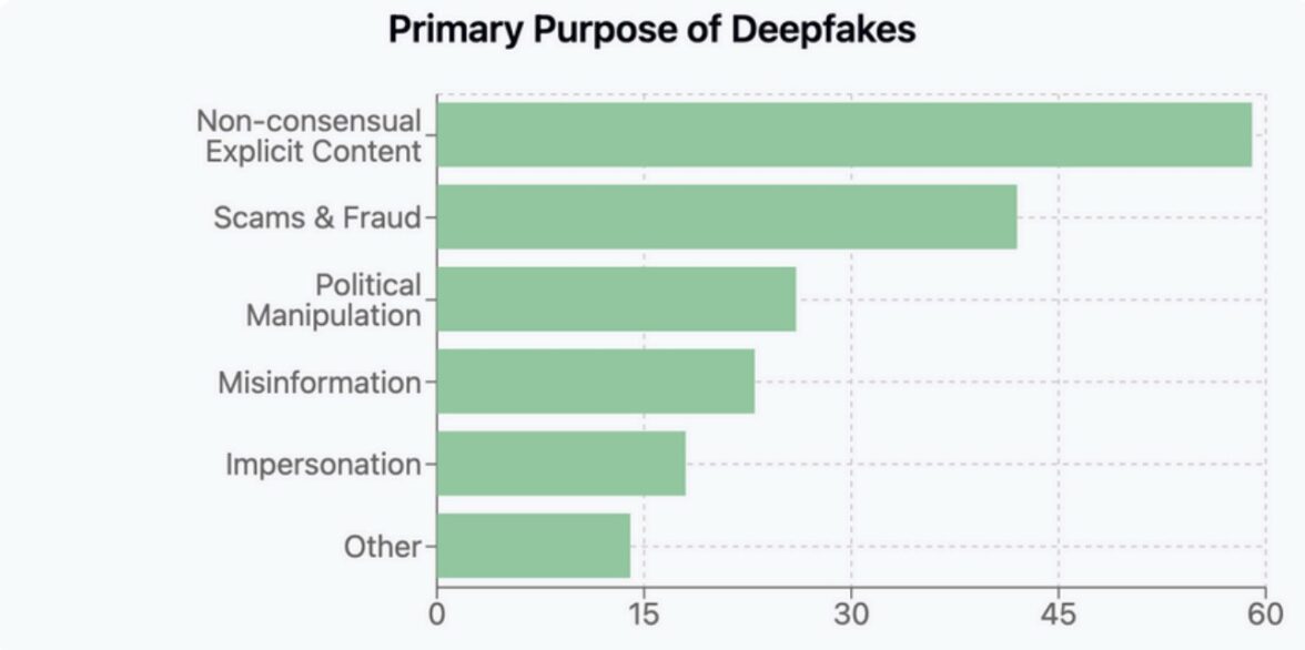 В докладе Resemble AI выделены следующие виды дипфейков. Треть дипфейков (32%) — откровенный контент, фото и видео сексуального характера, изготовленные без согласия изображаемых лиц. Жертвами чаще всего становятся женщины и девочки — как знаменитости и политики, так и обычные люди. Подобные материалы в некоторых случаях использовались дляпреследования, шантажа или мести. Жертвам наносится серьезный и долгосрочный психологический вред, при этом многие сообщают о трудностях с удалением вредоносного контента из интернета и соцсетей.