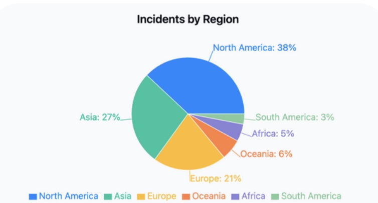 География инцидентов с дипфейками в 1 квартале 2025 года. Синий цвет — Северная Америка, зеленый — Азия, желтый — Европа, Оранжевый — Австралия и Океания, фиолетовый — Африка, салатовый — Южная Америка.