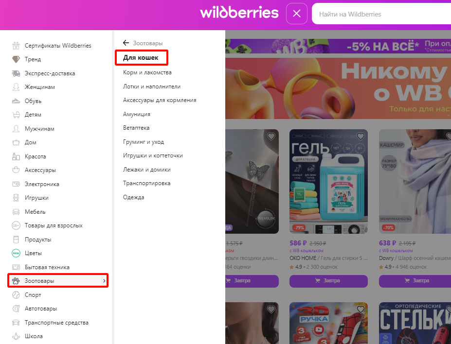 Начните с поиска товаров в нужной вам категории. Например, если вас интересуют товары для кошек, зайдите в эту категорию и выберите понравившиеся подкатегории, например, «Лежаки и домики». Это поможет сузить выбор и сосредоточиться на более конкретных товарах, с которыми легче работать.