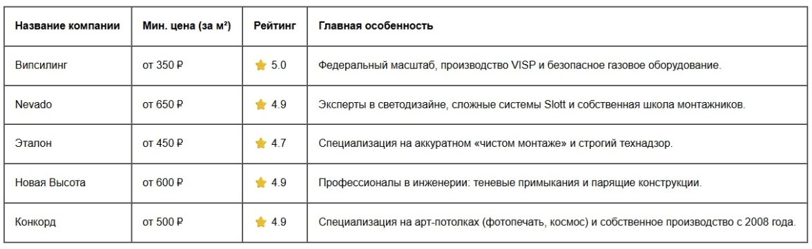 Таблица: Сравнение ТОП-5 компаний по натяжным потолкам в