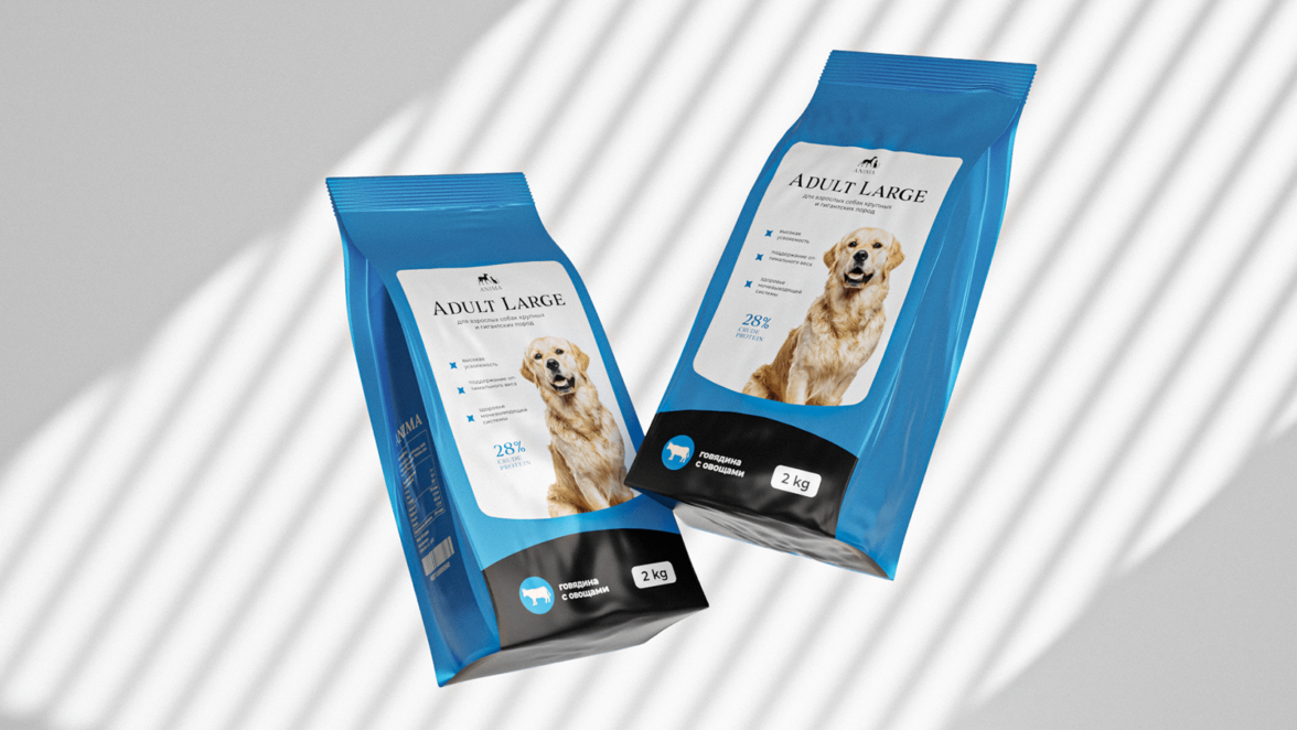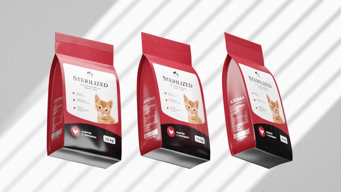 Создавая дизайн упаковки, клиент попросил разделить корма на 3 группы: для собак, для кошек и лечебные корма. Воплотить идею было несложно: так, синий цвет достался собакам, красный — котикам, а зелёный — специализированным кормам для животных с особыми потребностями.