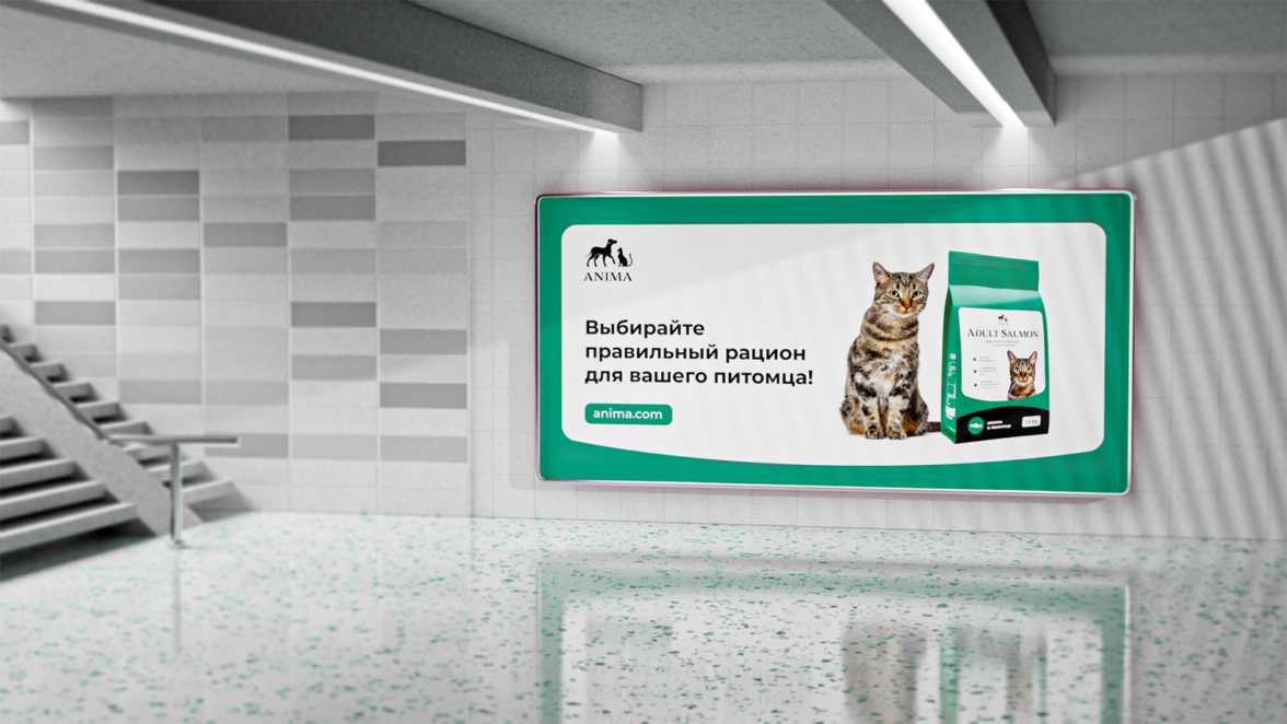 Стилеобразующим элементом стала рамка со скруглёнными углами. С одной стороны плашка символизирует улыбку — дружелюбие и открытость бренда, а с другой — окошко домика, откуда выглядывают животные. Этой метафорой мы стремились показать открытость бренда: ANIMA — «окно в мир животных» — знает, что точно нужно питомцам для поддержания здоровья и активного образа жизни.