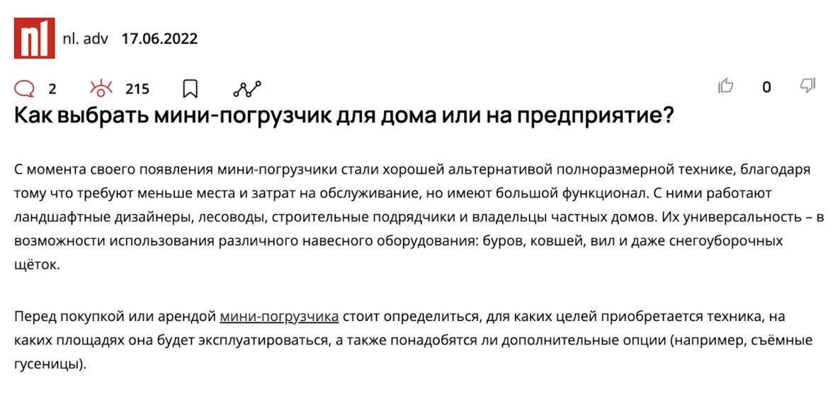 Это было нужно для продвижения по информационным запросам. В статьях мы настроили перелинковку с товарами и категориями спецтехники, чтобы мотивировать посетителей сайта совершить покупку.