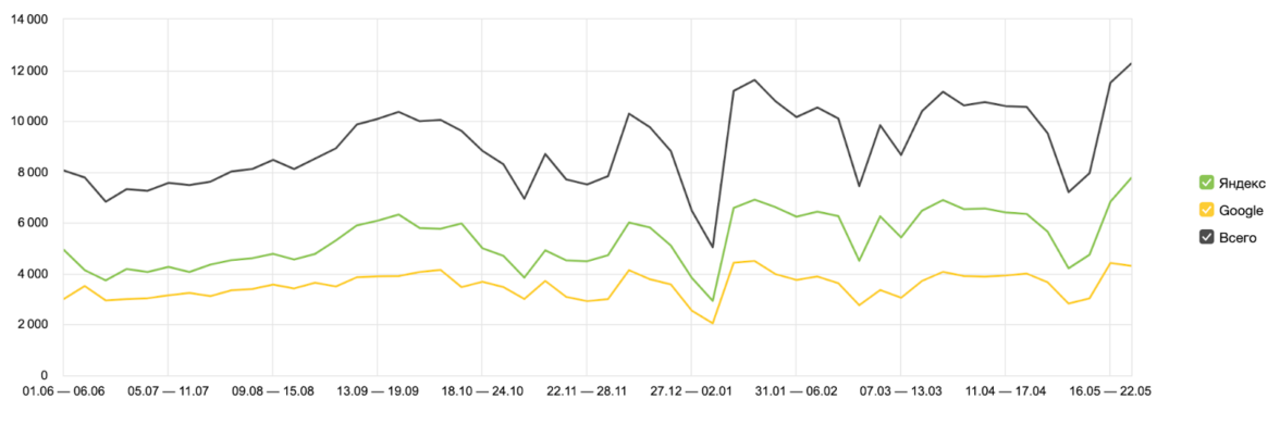 12 000 посетителей — трафик в мае 2022 (средний трафик в июне 2021 был 8 000 посетителей).