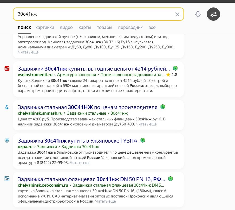 Нецелевые запросы. Для этого нужно проверить выдачу по запросу. Например, проверим выдачу по запросу «30с41нж» (ниже на скриншоте).