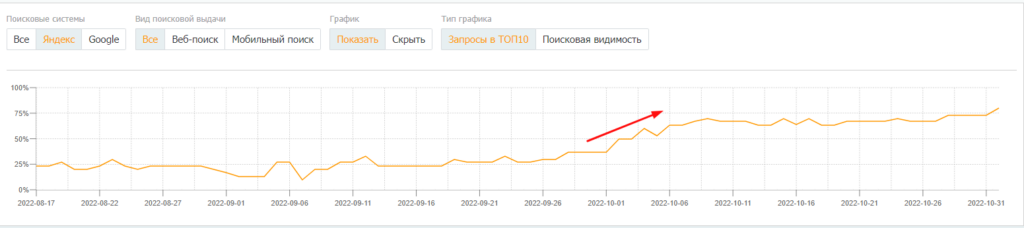 Заметный рост посещаемости наблюдаем уже через полтора месяца после начала продвижения, в начале октября 2022:
