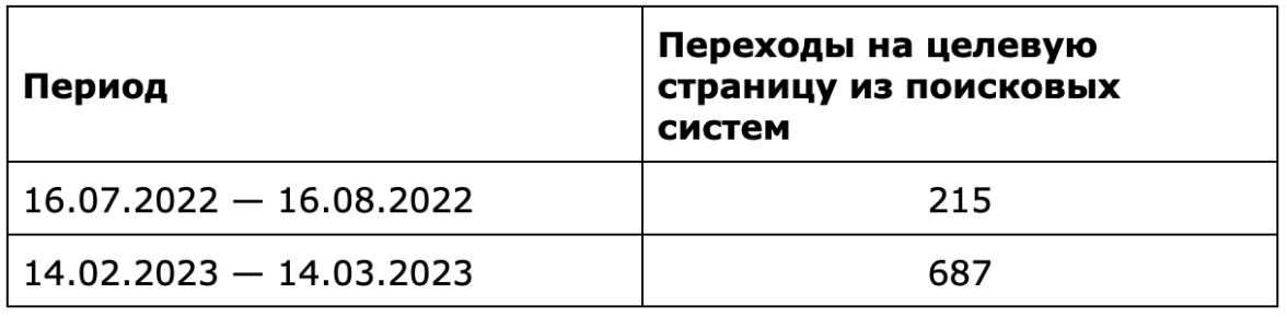 С ростом видимости сайта по ключевым словам увеличились и переходы на страницу услуги. Возьмем для сравнения данные за месяц до начала продвижения и данные за февраль-март 2023 года: