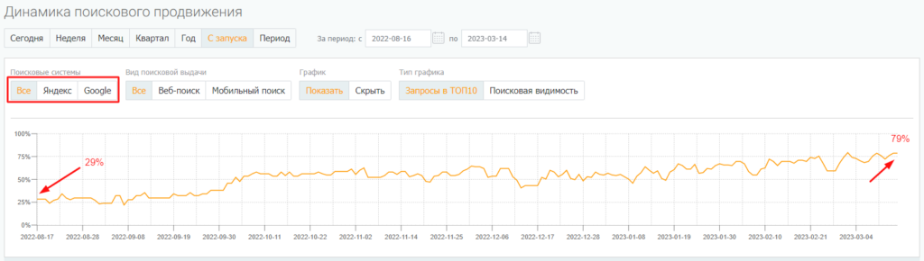 Динамика видимости по запросам в Яндексе и Google в интерфейсе PromoPult