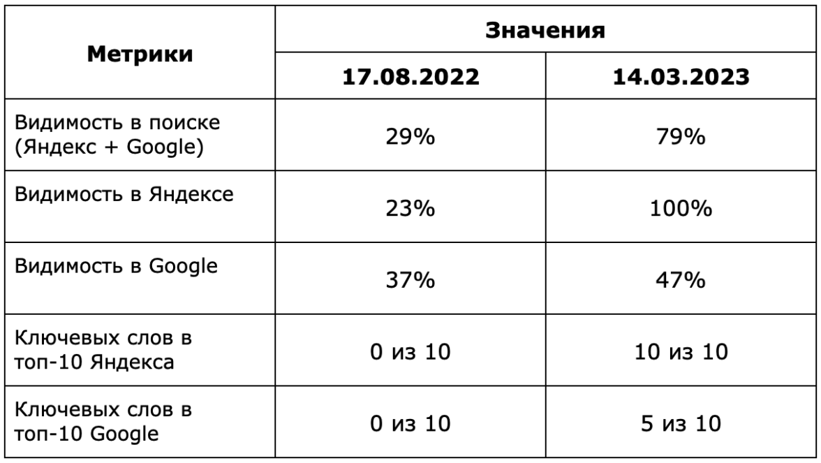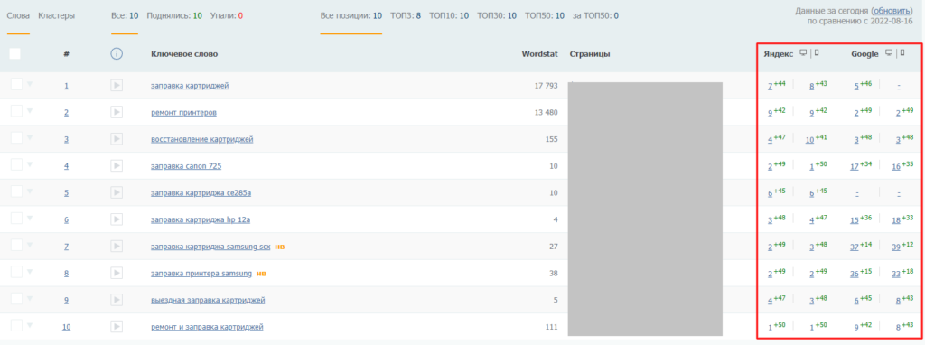 В таблице показан рост позиций по целевым ключевым запросам в десктопной и мобильной выдаче поисковых систем с начала продвижения: