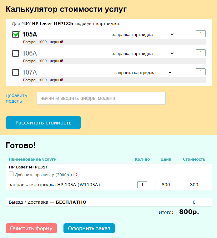 На сайте можно заказать срочную заправку картриджа в течение 3-х часов, также есть калькулятор для расчета стоимости заправки: