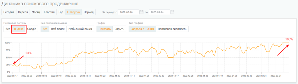 Динамика видимости по запросам в Яндексе с начала продвижения по 31.10.22