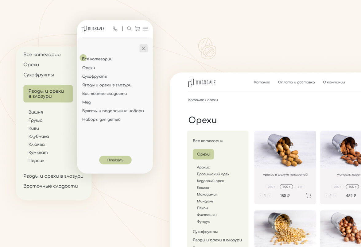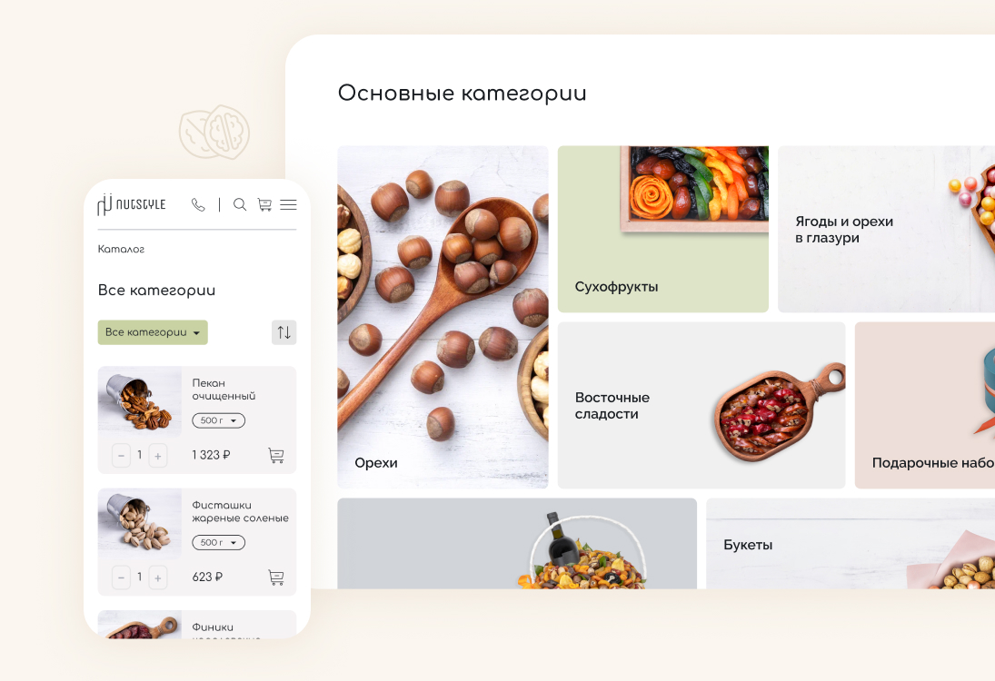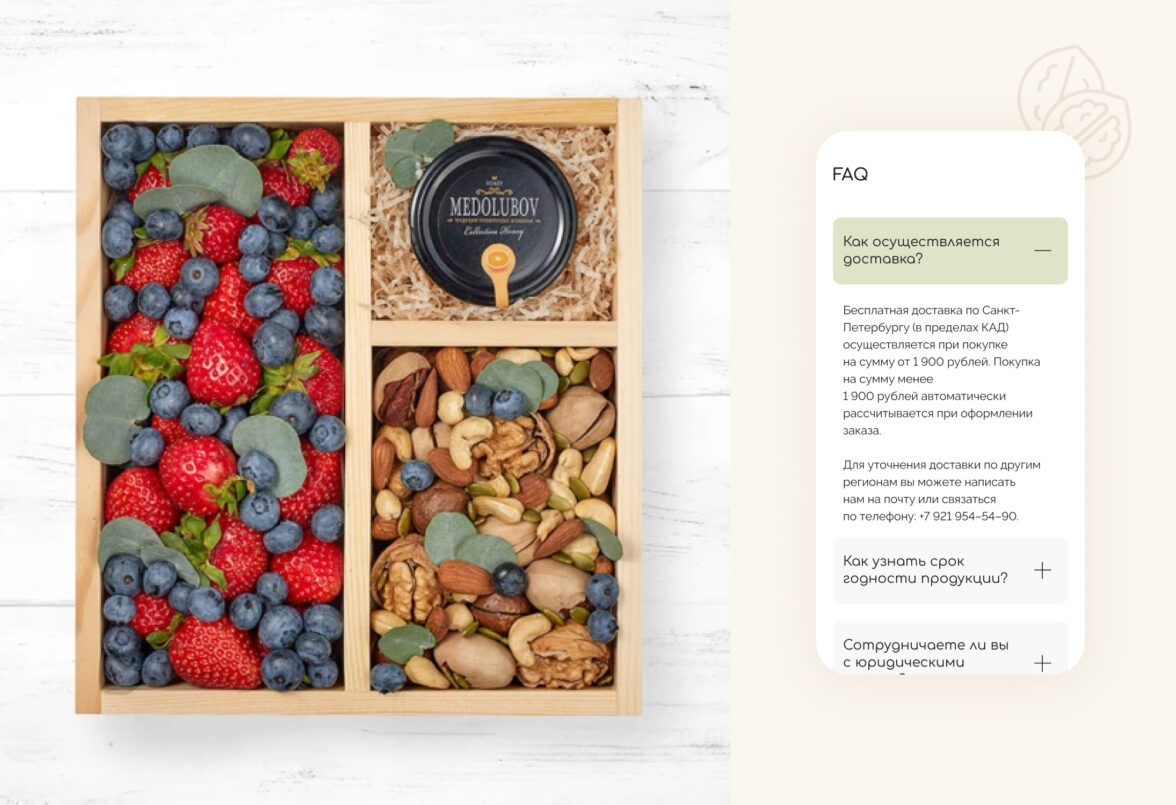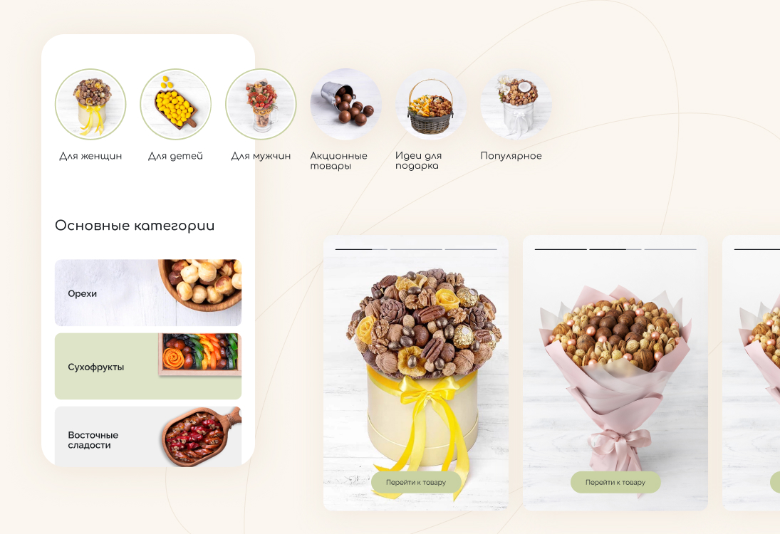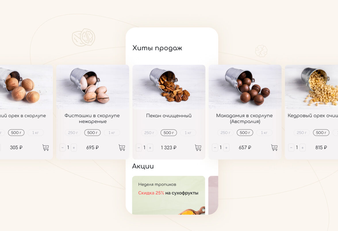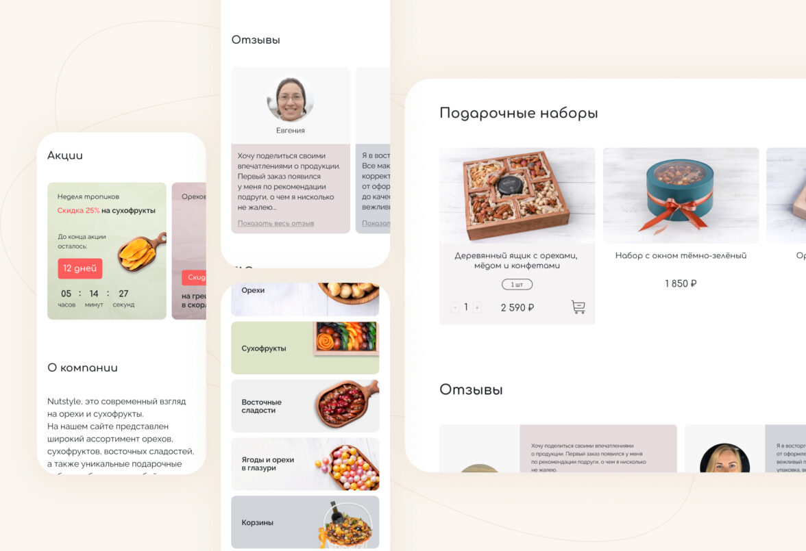 Начали работу над проектом с интервью с заказчиком, чтобы точно понять образ бренда и передать его через интерфейсы сайта. Провели исследование интернет-магазинов в этой тематике: от сайтов всех конкурентов создавалось ощущение, что ты попал на восточный базар, где нужно торговаться и отбирать качественный товар самому. Поэтому заложили кардинально противоположную концепцию — цветочно-ореховый бутик, где опытный food-флорист с вниманием к деталям подбирает подарок для любого повода.