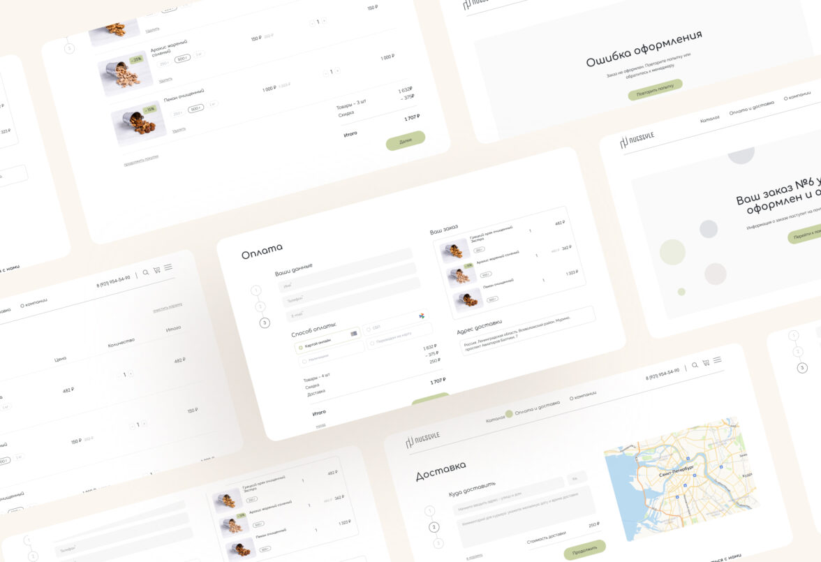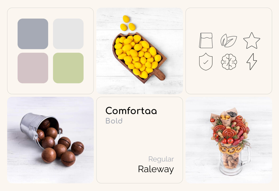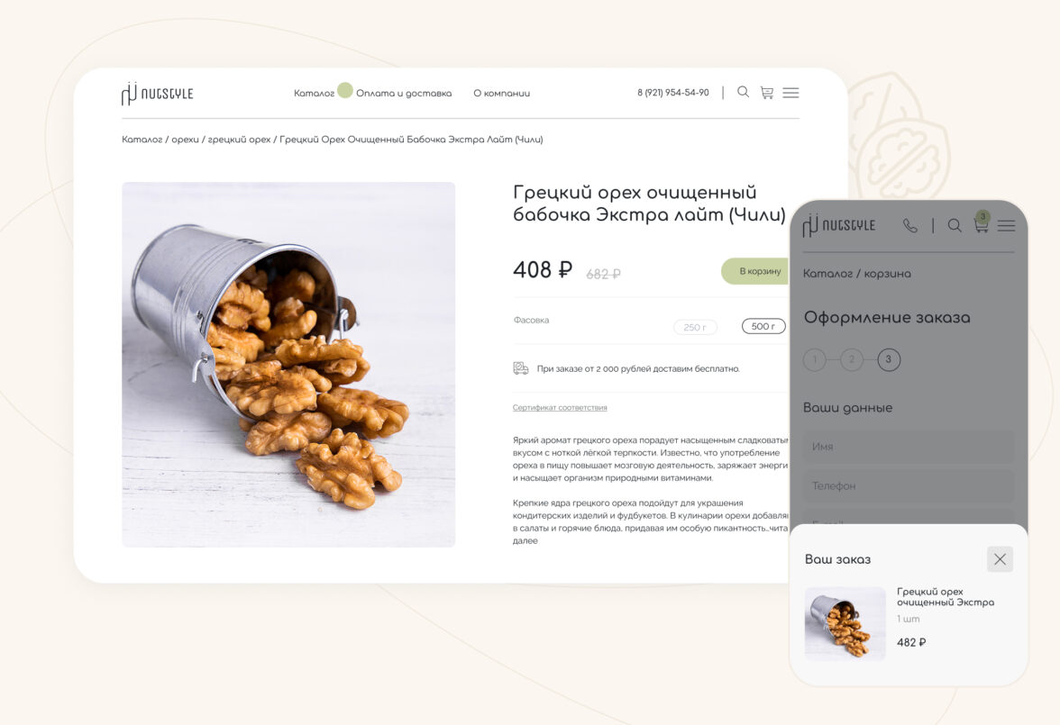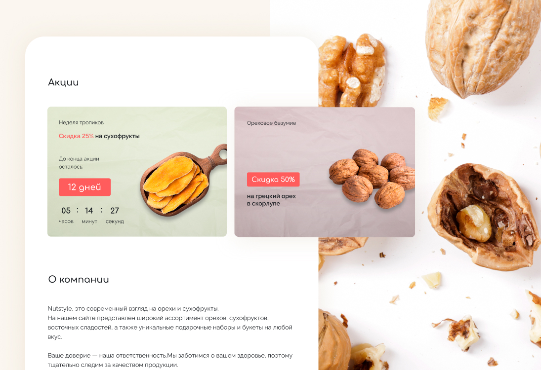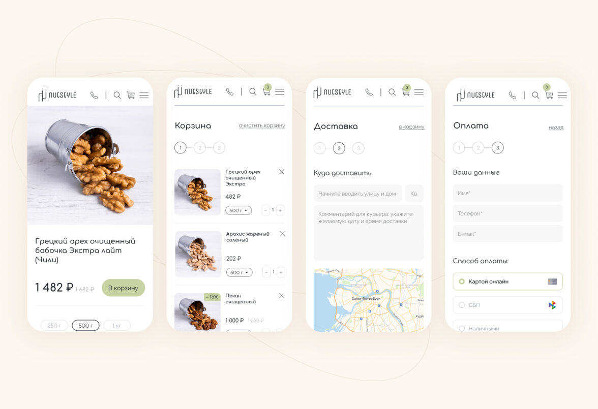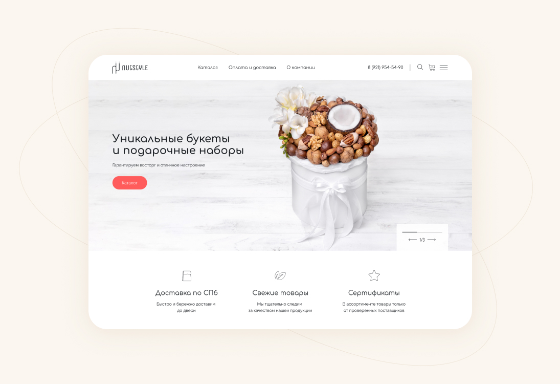 Начали работу над проектом с интервью с заказчиком, чтобы точно понять образ бренда и передать его через интерфейсы сайта. Провели исследование интернет-магазинов в этой тематике: от сайтов всех конкурентов создавалось ощущение, что ты попал на восточный базар, где нужно торговаться и отбирать качественный товар самому. Поэтому заложили кардинально противоположную концепцию — цветочно-ореховый бутик, где опытный food-флорист с вниманием к деталям подбирает подарок для любого повода.