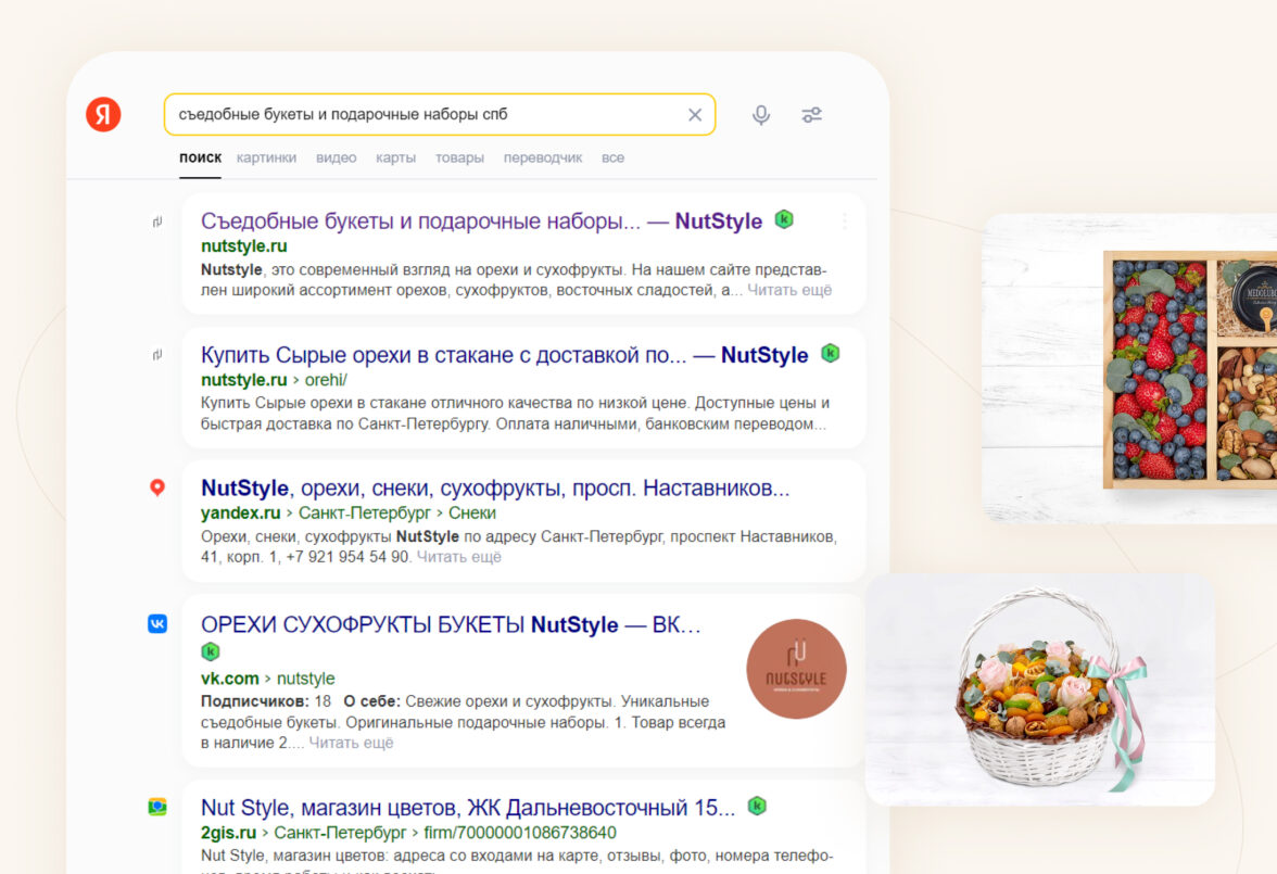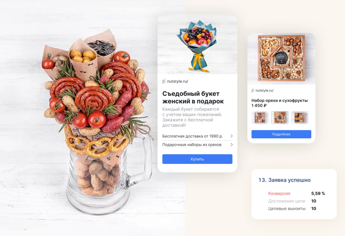 В нише подарочных букетов, орехов и сухофруктов высокая конкуренция. На старте компании цена клика оказалась очень высокой — трафика и заявок практически не было. Поэтому мы решили сконцентрироваться на продаже подарочных наборов и съедобных букетов через товарную кампанию и запустились в РСЯ. Это позволило показываться на поиске — в товарной галерее. Также на основе аффинити-индекса стали показывать рекламу по интересам — подарки для мужчин и для женщин, часть заявок получали оттуда.