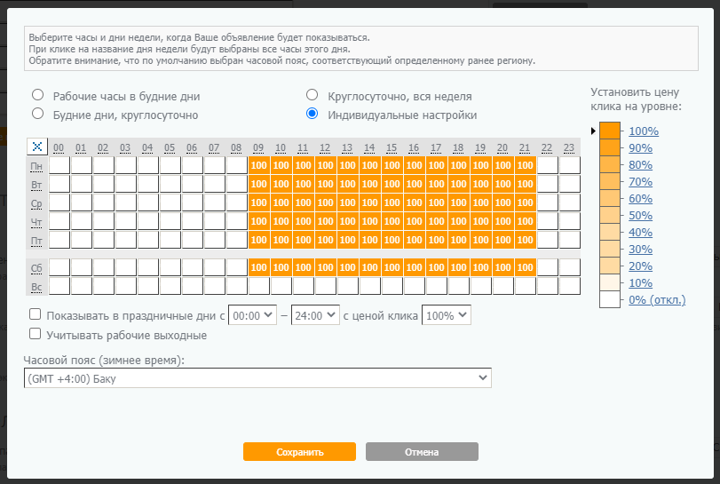 На основе данных веб-аналитики о посещаемости сайта настроили временной таргетинг: