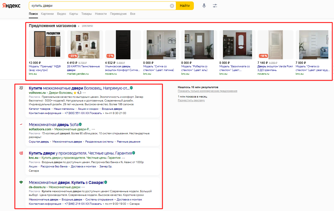 Рекламные размещения по запросу «купить двери» в регионе Самара