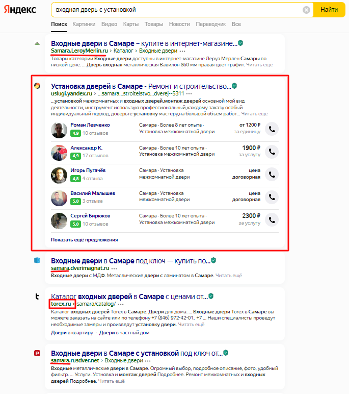 А что в органической выдаче? Возьмем среднечастотный запрос «входная дверь с установкой». Ситуация не лучше: в первой пятерке результатов — колдунщик Яндекс.Услуг, сайты Леруа Мерлен, Torex и региональные поддомены федеральных интернет-магазинов: