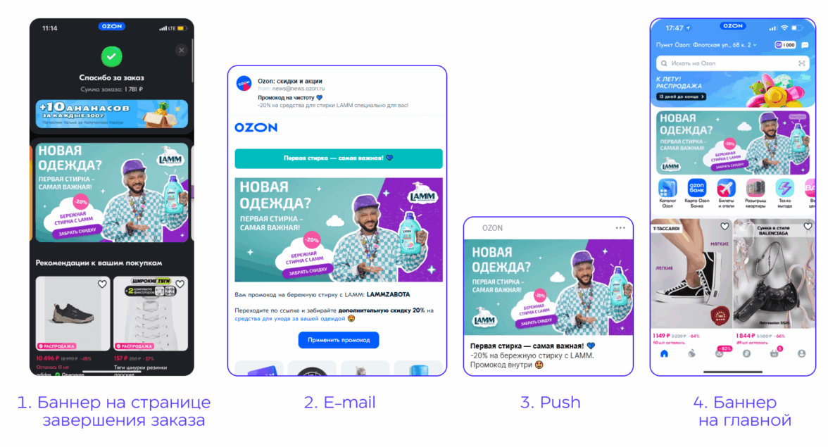 В условиях развитой логистики наибольший процент пользователей маркетплейса получают заказы быстро — в течение 2–3 дней. Пользователям, которые только забрали новую одежду, показывали баннер на главной странице Ozon с предложением рассмотреть средства для ухода за вещами, а также присылали им пуш-уведомление со схожим посылом.