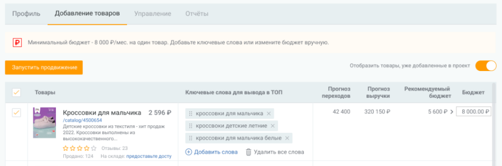 На продвижение каждого товара будет рассчитан рекомендованный бюджет, его можно скорректировать. Минимальный бюджет для продвижения одной карточки товара в месяц — 8000 рублей.