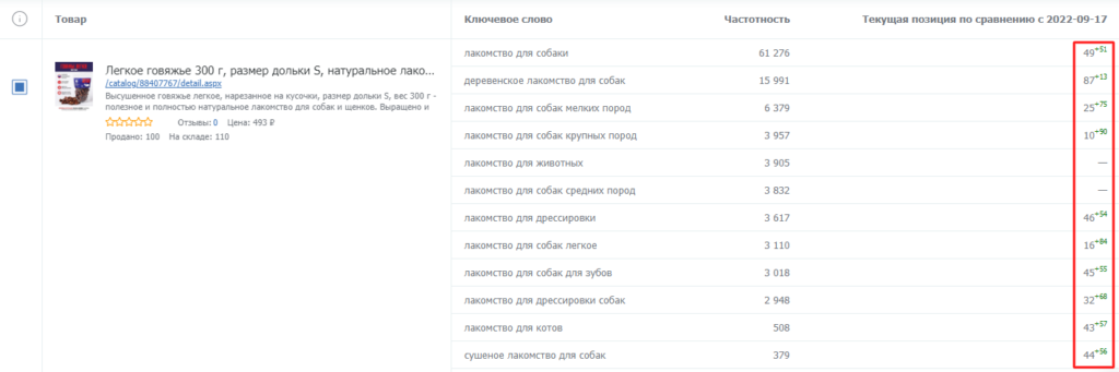 По запросу «лакомство для собак крупных пород» карточка товара вышла в топ-10 поиска Wildberries, по запросу «лакомство для собак легкое» — в топ-20.