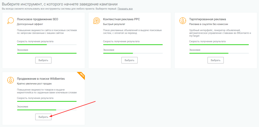 Авторизуемся или регистрируемся в PromoPult. Выбираем модуль «Продвижение в поиске Wildberries»: