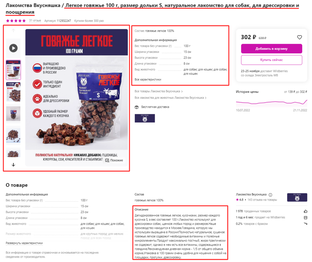 Оформление карточки товара магазина «Лакомства Вкусняшка» на Wildberries