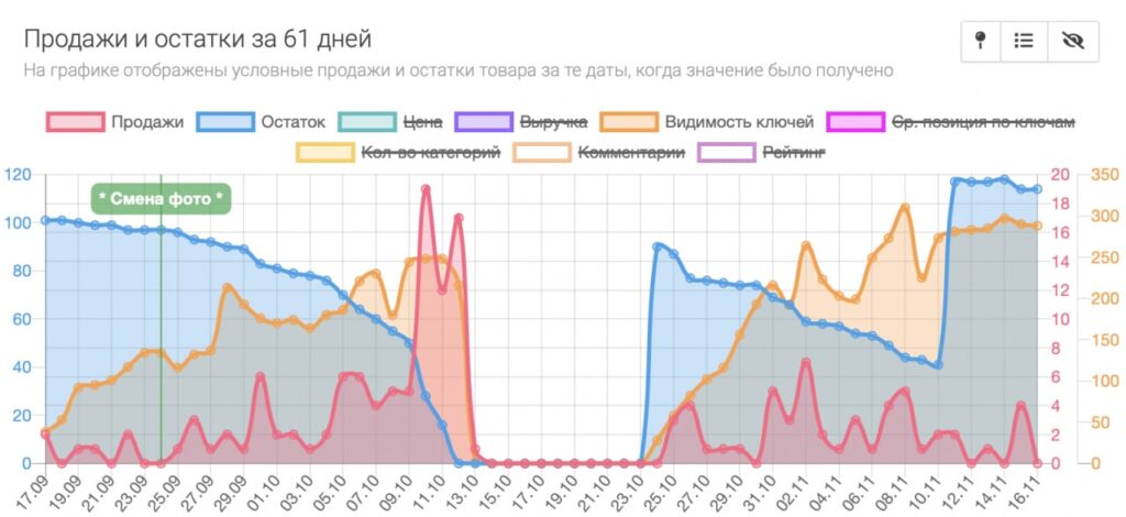 На графиках заметна просадка показателей в период с 13 по 23 октября. Это связано с тем, что после резкого роста продаж товар закончился на складе и в результате пропал из выдачи Wildberries.